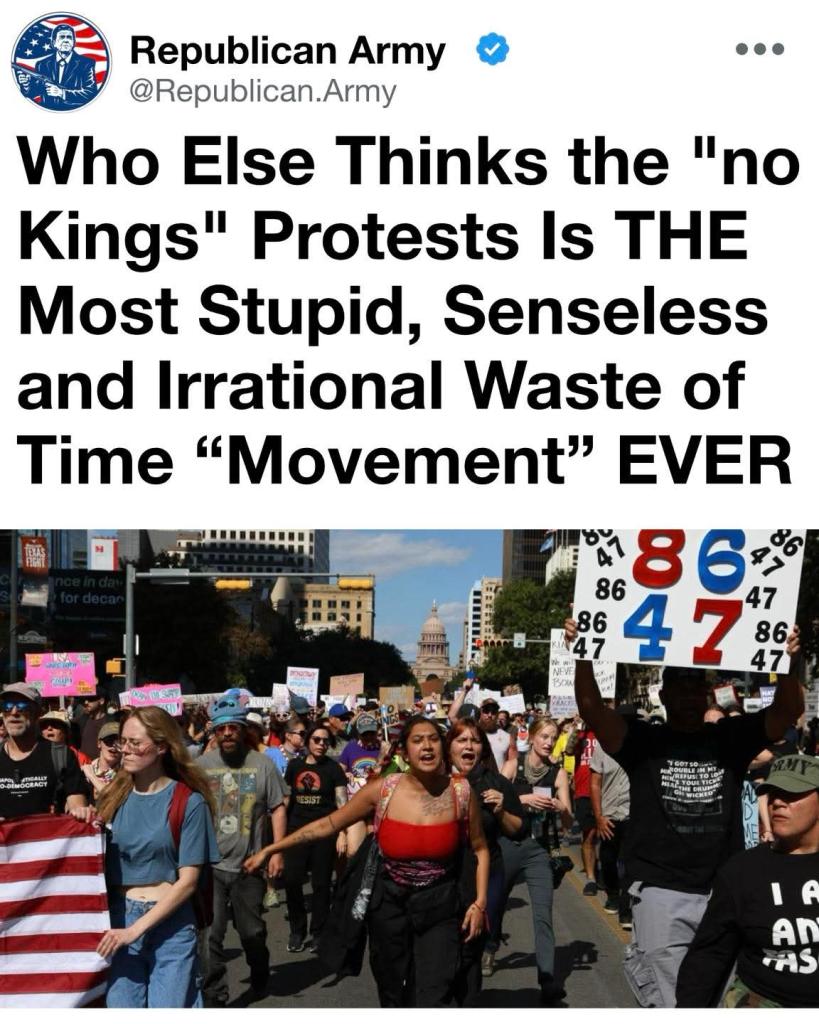 True patriotism means respecting institutions even when they don’t deliver perfect outcomes. America’s greatness comes from debate and elections, not manufactured outrage against phantom monarchs. Let’s channel that passion into building, not tearing down.