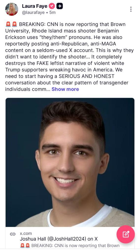 🚨🚨 BREAKING: CNN is now reporting that Brown University, Rhode Island mass shooter Benjamin Erickson uses “they/them” pronouns. He was also reportedly posting anti-Republican, anti-MAGA content on a s... View More