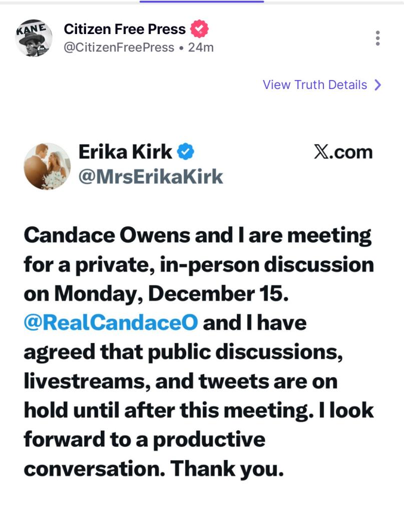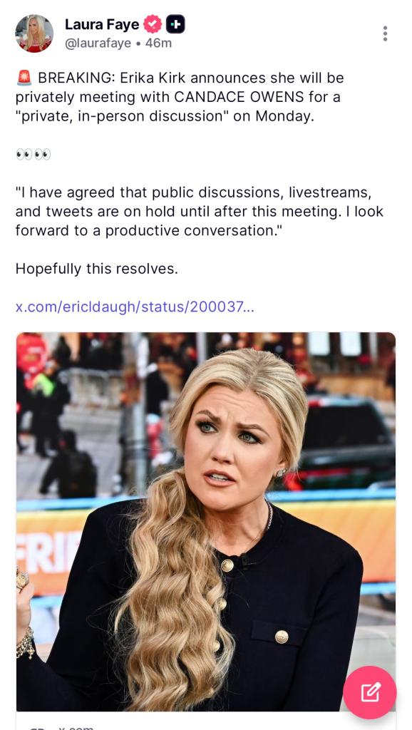 🚨 BREAKING: Erika Kirk announces she will be privately meeting with CANDACE OWENS for a "private, in-person discussion" on Monday.