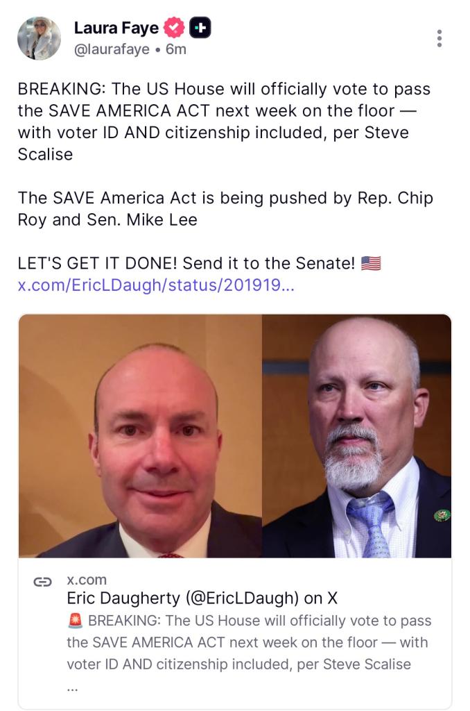BREAKING: The US House will officially vote to pass the SAVE AMERICA ACT next week on the floor — with voter ID AND citizenship included, per Steve Scalise