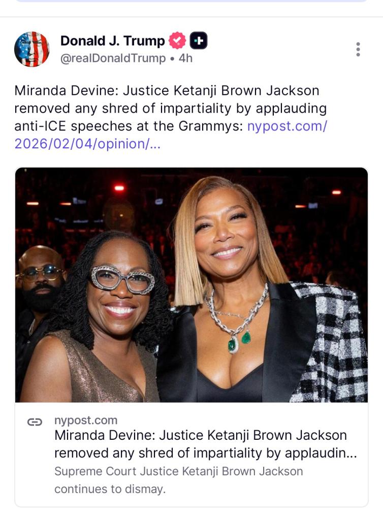 Miranda Devine: Justice Ketanji Brown Jackson removed any shred of impartiality by applauding anti-ICE speeches at the Grammys: https://nypost.com/2026/02/04/opinion/miranda-devine-justice-ketanji-bro... View More