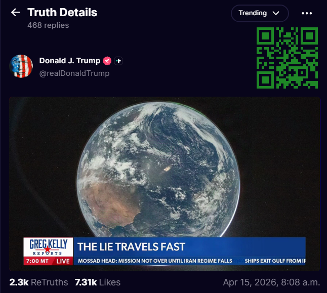 CIC @POTUS Trump (Q+) Posted A 14 Minute @NEWSMAX Clip From @gregkellyusa On His Truth Social Account April 15, 2026 That Opens With A CGI Fake Globe Image.