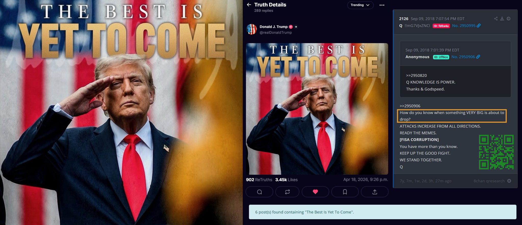CIC POTUS Trump (Q+) Posts Popular Q Slogan Image For The Second Time On His Truth Social Account, "The Best Is Yet To Come" With Timestamp Hinting Something VERY BIG is about to drop (ET/UFO Files?) ... View More