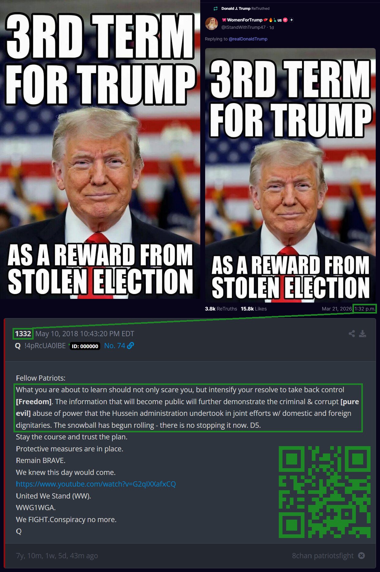 CIC POTUS Trump (Q+) Reposted An Image March 22, 2026 From The Prior Day Stating "3rd Term For Trump As A Reward From Stolen Election" a.k.a. Dash Extension From 45 To 48.
