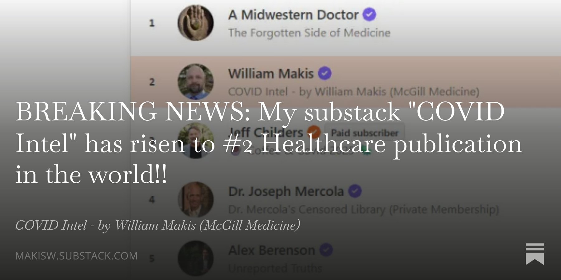 BREAKING NEWS: My substack "COVID Intel" has risen to #2 Healthcare publication in the world!!