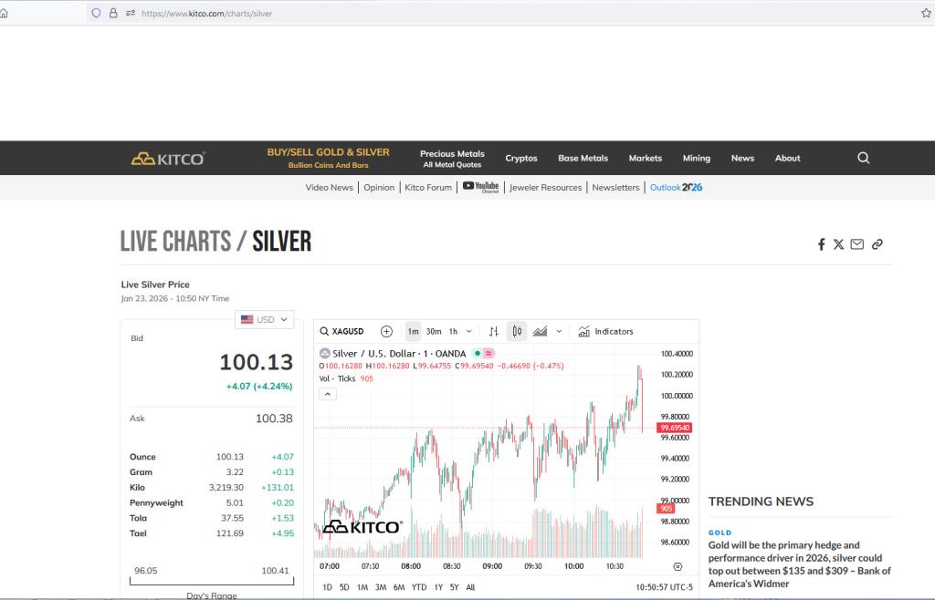 While "spot" price reflects fake/fiat/paper value it did hit $100 this morning.... The actual "value" of silver is REPLACEMENT cost, how much will it cost you in fiat paper to replace a piece of silve... View More