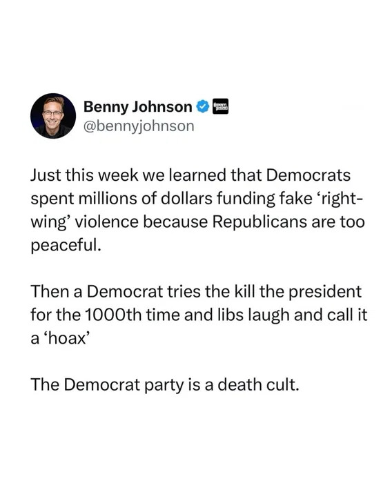The Demoncrat Party should be classified as a terrorist organization. That goes for every member that stays in this Party. No difference between this Party than other terrorist organizations!! So, I guess they truly are ABOVE THE LAW and they throw that in our faces every day. Can't come to a good e... View More