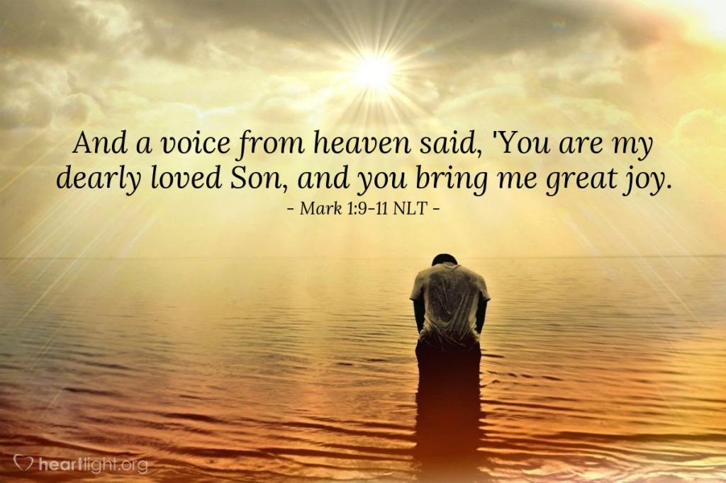 One day Jesus came from Nazareth in Galilee, and John baptized him in the Jordan River. As Jesus came up out of the water, he saw the heavens splitting apart and the Holy Spirit descending on him like a dove. And a voice from heaven said, 'You are my dearly loved Son, and you bring me great joy.' — Mark 1:9-11 NLT