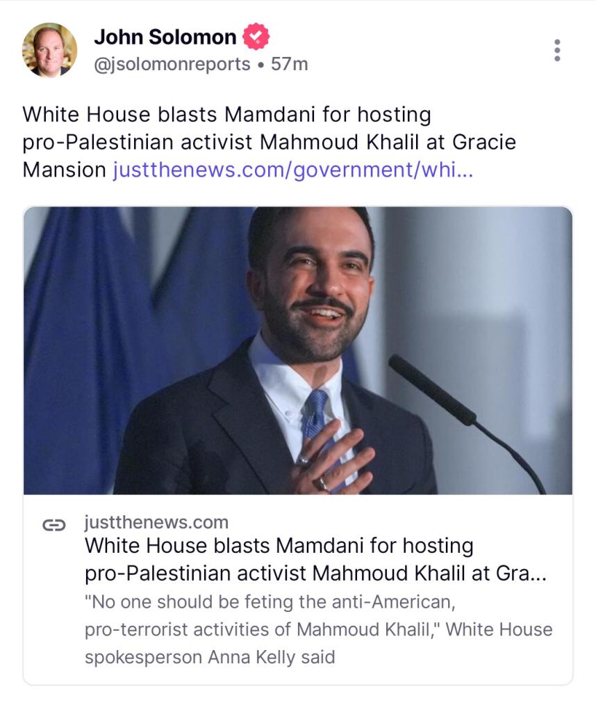 White House blasts Mamdani for hosting pro-Palestinian activist Mahmoud Khalil at Gracie Mansion https://justthenews.com/government/white-house/white-house-blasts-mamdani-hosting-pro-palestinian-activ... View More