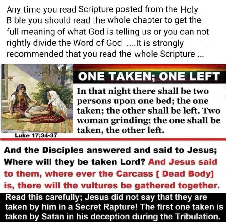 We repeat "...one (the one who believes the flood of lies) shall be "taken",