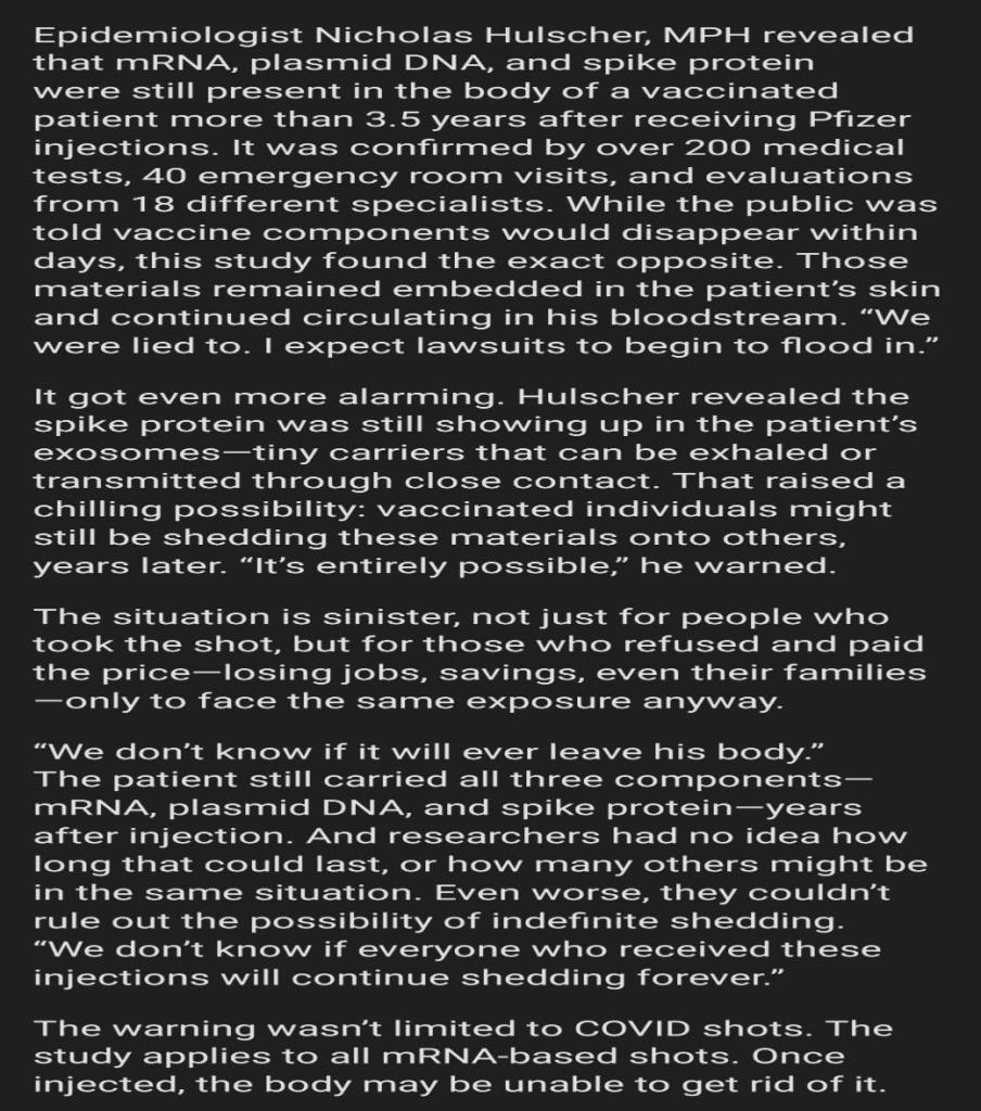 Epidemiologist Nicholas Hulscher, MPH revealed that mRNA, plasmid DNA, and spike protein were still present in the body of a vaccinated patient more than 3.5 years after receiving Pfizer injections. I... View More