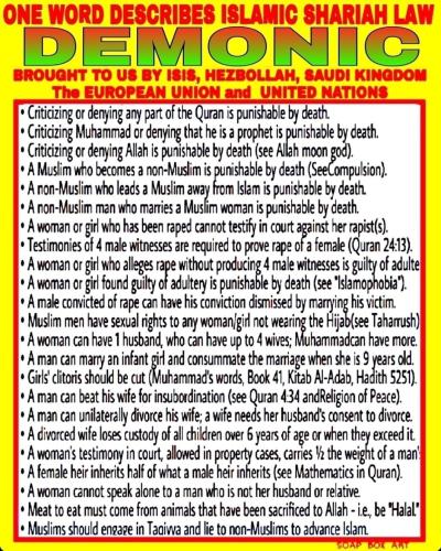 EVERY PERSON NEEDS TO UNDERSTAND THAT ISLAM IS NOT A RELIGION, ISLAMIC SHARIAH LAW IDEOLOGY IS A POLITICAL BACKWARD TOTALITARIAN, ENSLAVEMENT IDEOLOGY RUN BY A BUNCH OF SEXUALLY PERVERTED PEDOPHILES THAT HAS NO PLACE IN A MORALLY CONSCIOUS, MULTICULTURAL, MULTI-RELIGIOUS, FREEDOM LOVING SOCIETY SO ... View More
