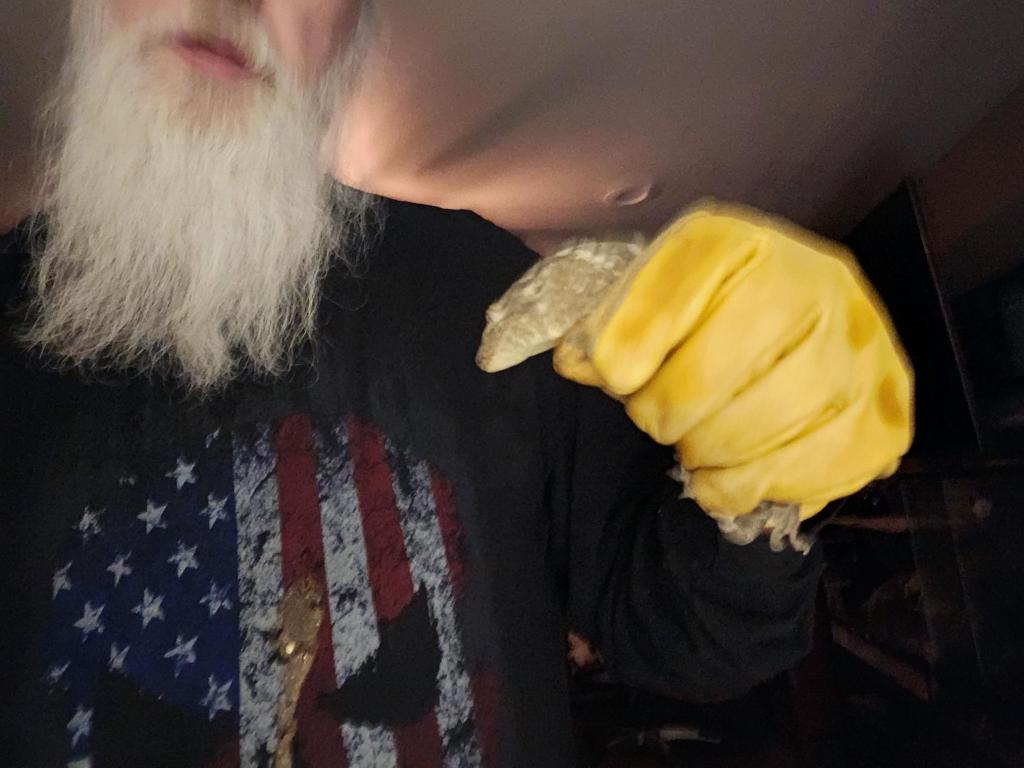 Fang, my female leachianus gecko got mad because she couldn't bite me through the glove so she shot me instead. A pretty good shot too, right between the eyes. :grin::skull::poop: