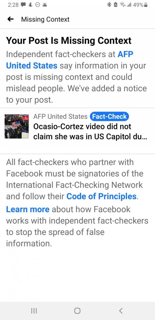 It's interesting that Facebook did this. I'm pretty sure they didn't flag AOC's post that it's missing context because she wasn't at the Capitol--in case people misinterpret her hyperbole.