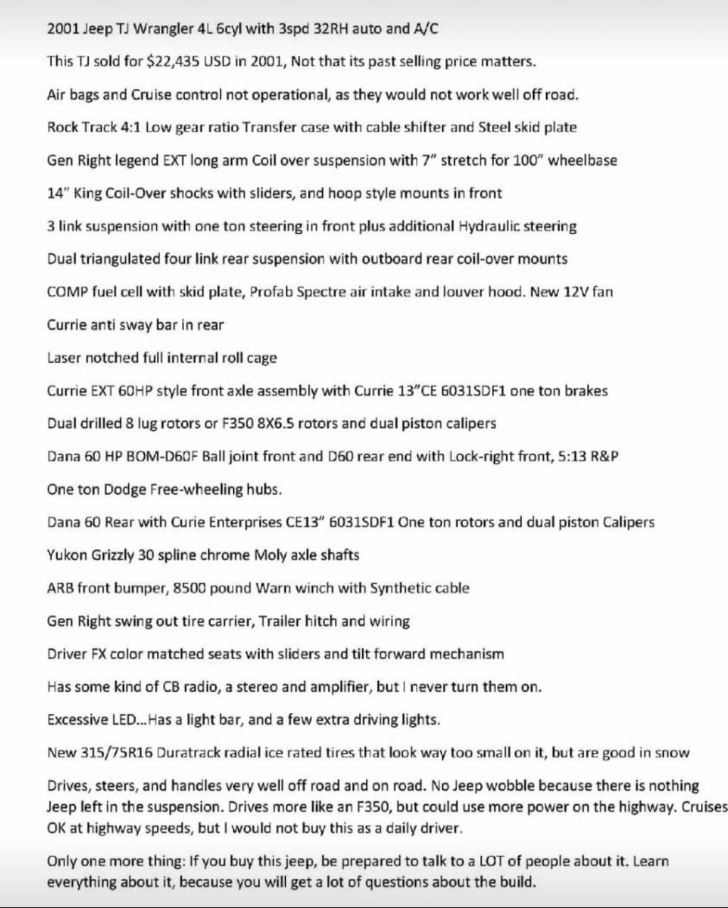 2002 Jeep Wrangler TJ with one ton Dana 60 front and back. Extremely well built long travel suspension and interior roll cage. Four liter engine with auto, A/C and a long build list. I can send photos... View More