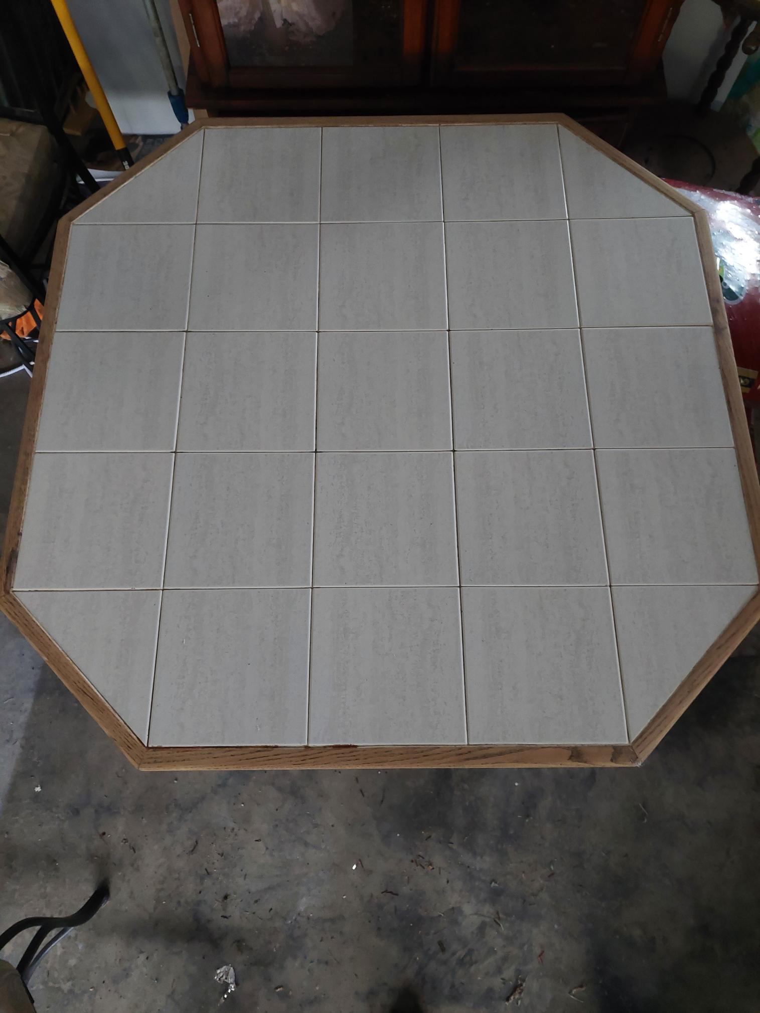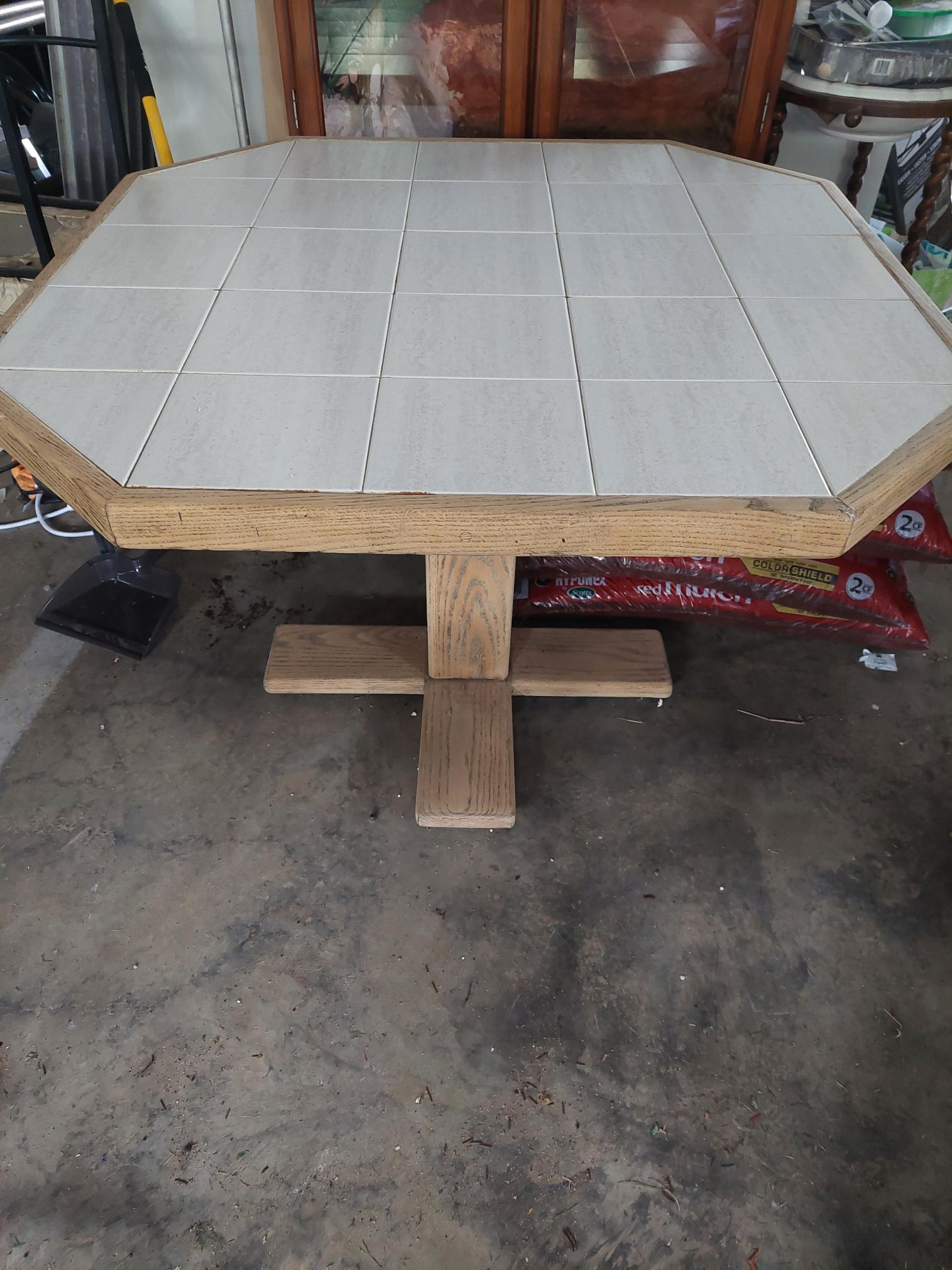 Oak table with tile top. Metal chairs.
