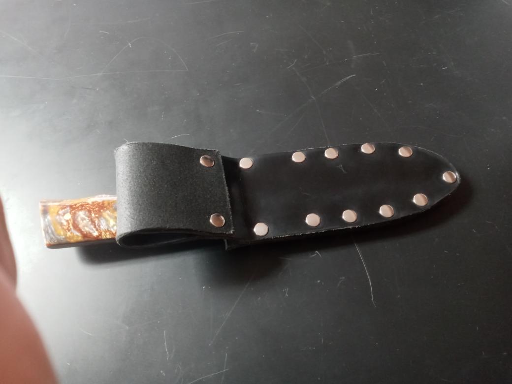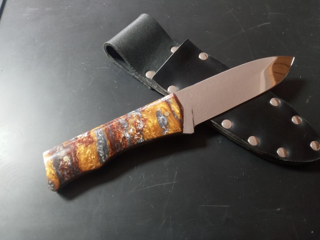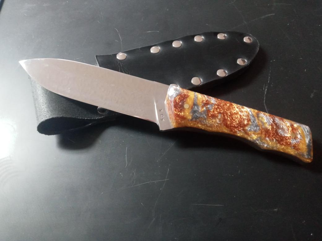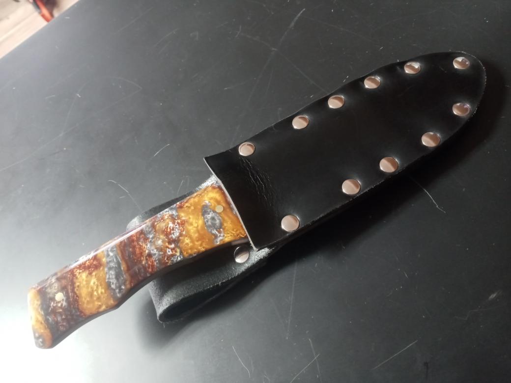 5160, brass pins, *Molten Metal poly-pearl handle scales, flat saber/compound bevels, high polish, all leather 3 layer fitted sheath. Hand forged, hardened and tempered by me, RBK....all knives have a lifetime warranty for materials and craftsmanship. 59-