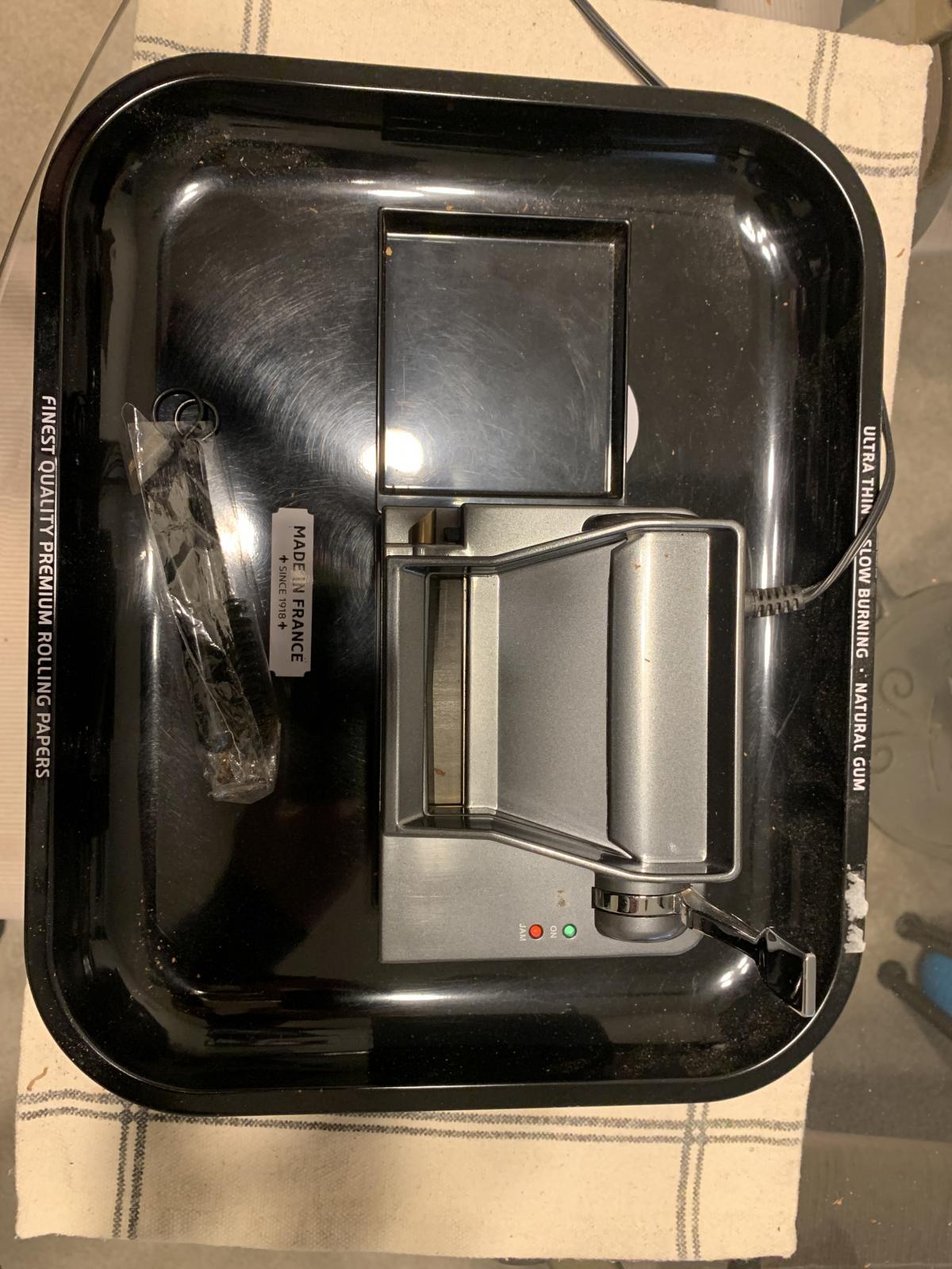 Works great. Very well maintained. Just quit. Comes with rolling tray, cleaning tools, and 2 cases for your smokes