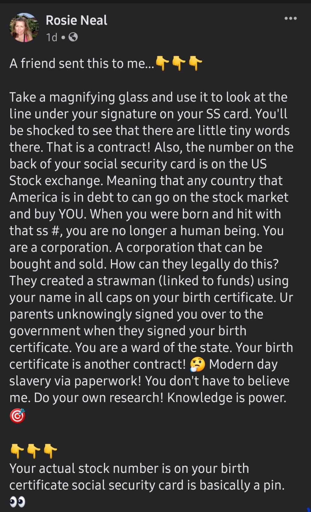 "A friend sent this to me...???Take a magnifying glass and use it to look at the line under your signature on your SS card. You'll be shocked to see that there are little tiny words there. That is a contract! Also, the number on the back of your social security card is on the US Stock exchange. Meaning that any country that America is in debt to can go on the stock market and buy YOU. When you were born and hit with that ss #, you are no longer a human being. You are a corporation. A corporation that can be bought and sold. How can they legally do this? They created a strawman (linked to funds) using your name in all caps on your birth certificate. Ur parents unknowingly signed you over to the government when they signed your birth certificate. You are a ward of the state. Your birth certificate is another contract! ? Modern day slavery via paperwork! You don't have to believe me. Do your own research! Knowledge is power. ????Your actual stock number is on your birth certificate social security card is basically a pin. ?"https://m.facebook.com/story.php?story_fbid=10220922236019068&id=1035513944