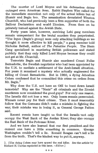 "Another American, John Demjanjuk of Cleveland, Ohio, has been taken to Israel and tried for “Nazi” crimes. Evidence isn’t needed in such cases, according to the Israeli government. Fake documents are turned out quickly and that is all that is requited. Patrick Buchanan of the White House staff said he has absolute proof that Mr. Demjanjuk is innocent and is merely the victim of mistaken identity and a great miscarriage of justice. So much for his opinion.While on the subject of war criminals. I’d like to mention one of the real ones. Mr. Richard Lessner, editorial writer of the Arizona Republic, wrote an article about Prime Minister Yitzhak Shamir of Israel. Mr. Lessner is one of the few jouma- (continued in picture...)