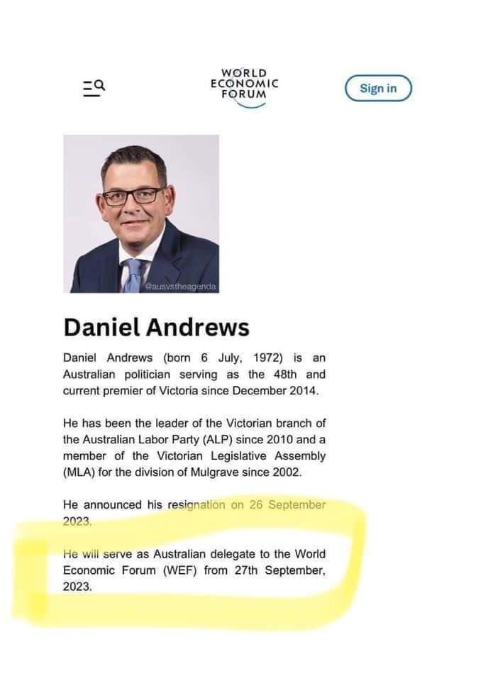 Dan Andrews, the brutal dictator of Victoria, Australia has quit and is off to work for the WEF...