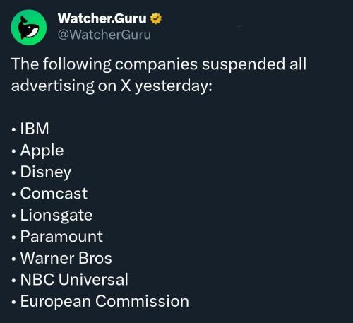 So far.. these companies have cancelled X because 'Those who cannot be named' have been 'Insulted' by Elon Musks reply to a tweet. 'To find out who rules over you.. first find out who you cannot criticize' is given credence here...
