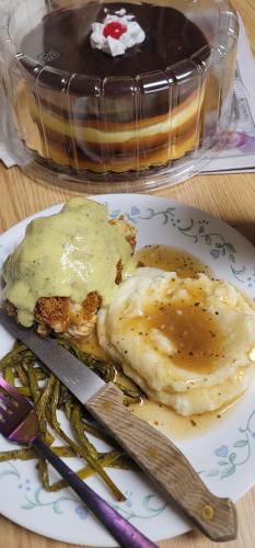 Single working dad.I cook real food.Chicken breast ham and provolone egged and breaded, mashed potatoes, with turkey gravy and a Bearnaise sauce for the chicken, Toasted, Peppered, parmasian, asparagus I love my kids