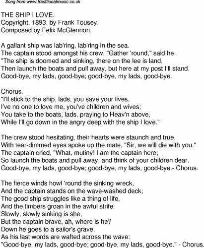 Here is an example of an Irish shanty song. A bit morbid, but a good example of the type sung by old sea going sailors as they went about their ship board duties: