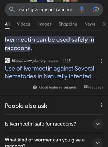 I give my raccoons Ivermectin all the time, helps them when they have stomach issues from getting into the old cheese. Not sure what this meme is suggesting since google told me it can work but to check with my vetrenarian. Good advice from google 👍