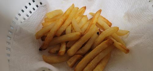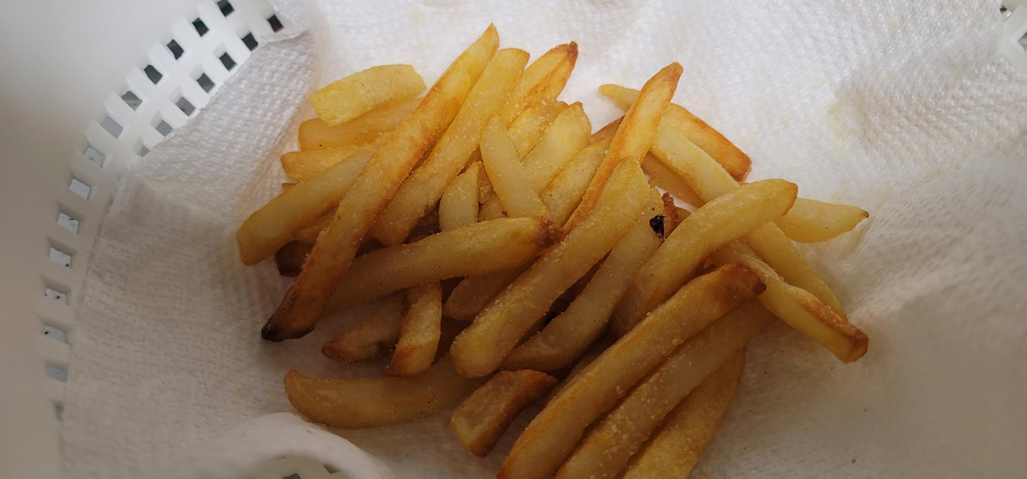 Avacado light spray 6 minutes at 400 degrees F. Stop shake grated Parmesan Cheese. Then 6 more minutes to toast the cheese into the fries finished in the Air FRYER