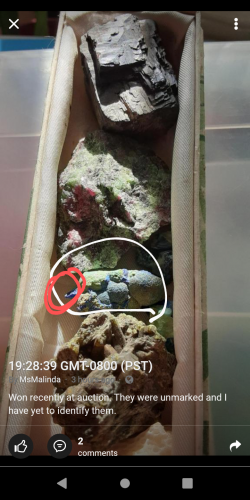 Azurite maybe but the part that has a red outlined looks like a different type of stereo chemistry.azurite is a copper mineral.If you can enable take some more pictures close up pictures of these in different parts and if you having trouble getting a good picture of the character of the Stone see if... View More