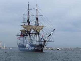 A rare photo. The USS Constellation, sister ship to the USS Constitution, away from dock, under sail, firing its guns.