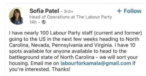 BREAKING: Labour’s Head of Operations, Sophia Patel, has deleted her LinkedIn profile and locked her Twitter after explosive allegations surfaced that she organized 100 Labour staffers to meddle in the 2024 US election—allegedly to prevent Donald Trump’s reelection.