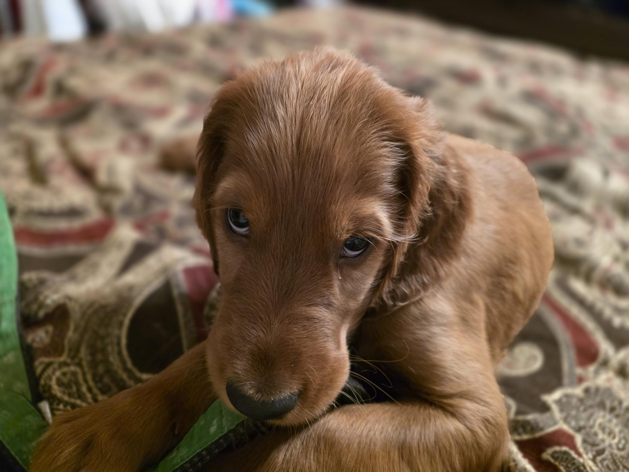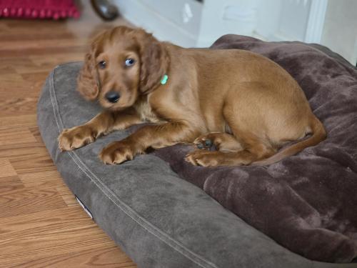 He's a cutie IRISH Red Setter on the master bed..