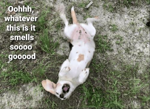 My dog rolled in a pile of baby calf scours. At first, I couldn't tell what it was until I found the pile and the calf. I had to bathe my dog 3 times outside.