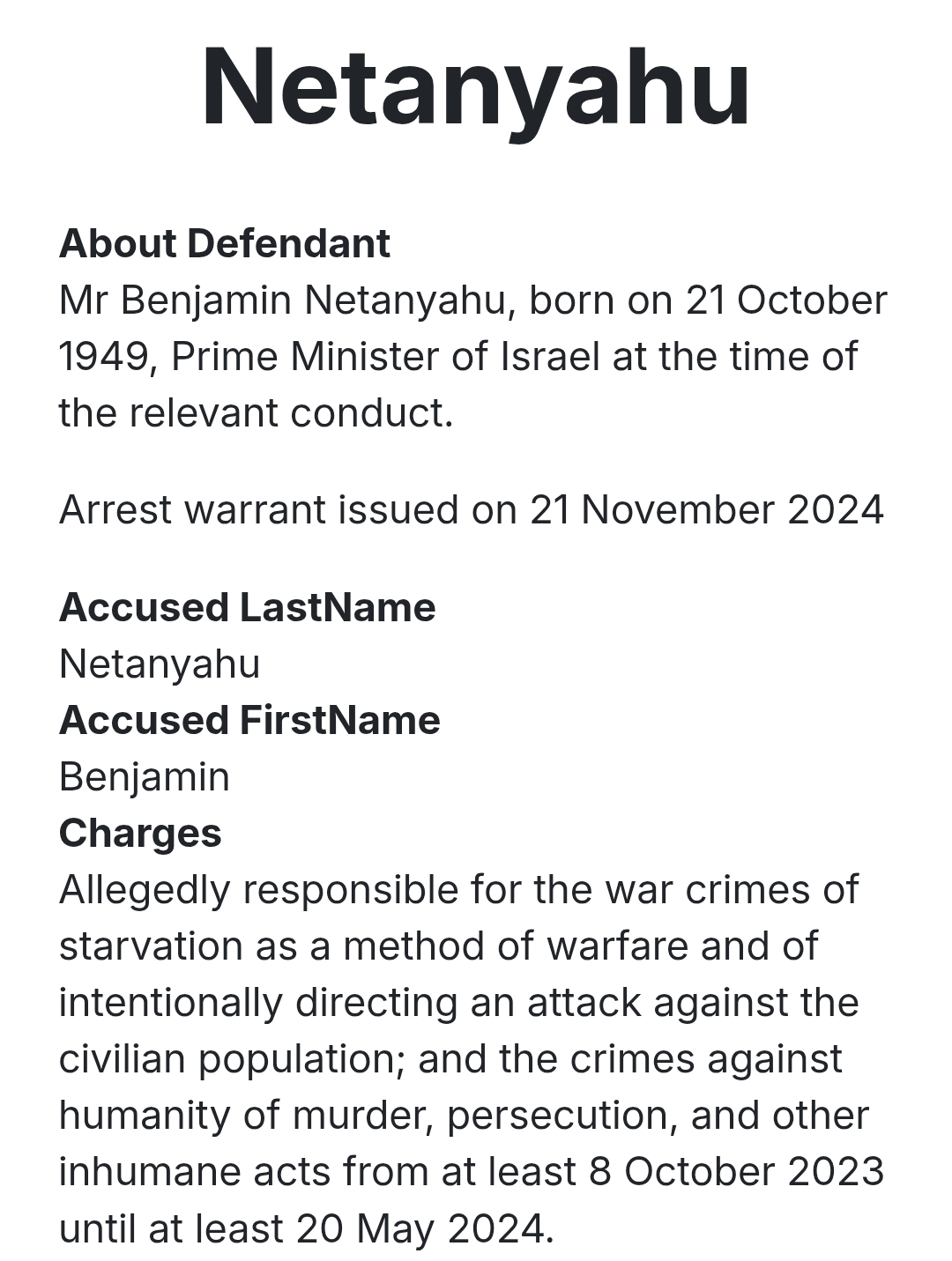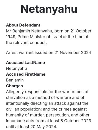Bibi is wanted by the International Criminal Court for War Crimes/Crimes Against Humanity. 125 Countries are Members of the ICC.