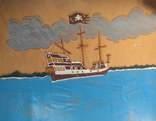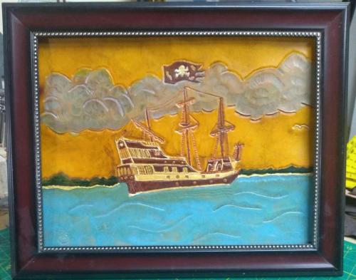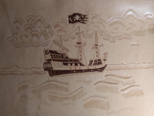 I'm working on a leather project - a pirate ship. It'll be framed and will be in five different brown dye shades. I still have more detail work to do on the ship and background but its coming along. I included a photo of the actual ship.