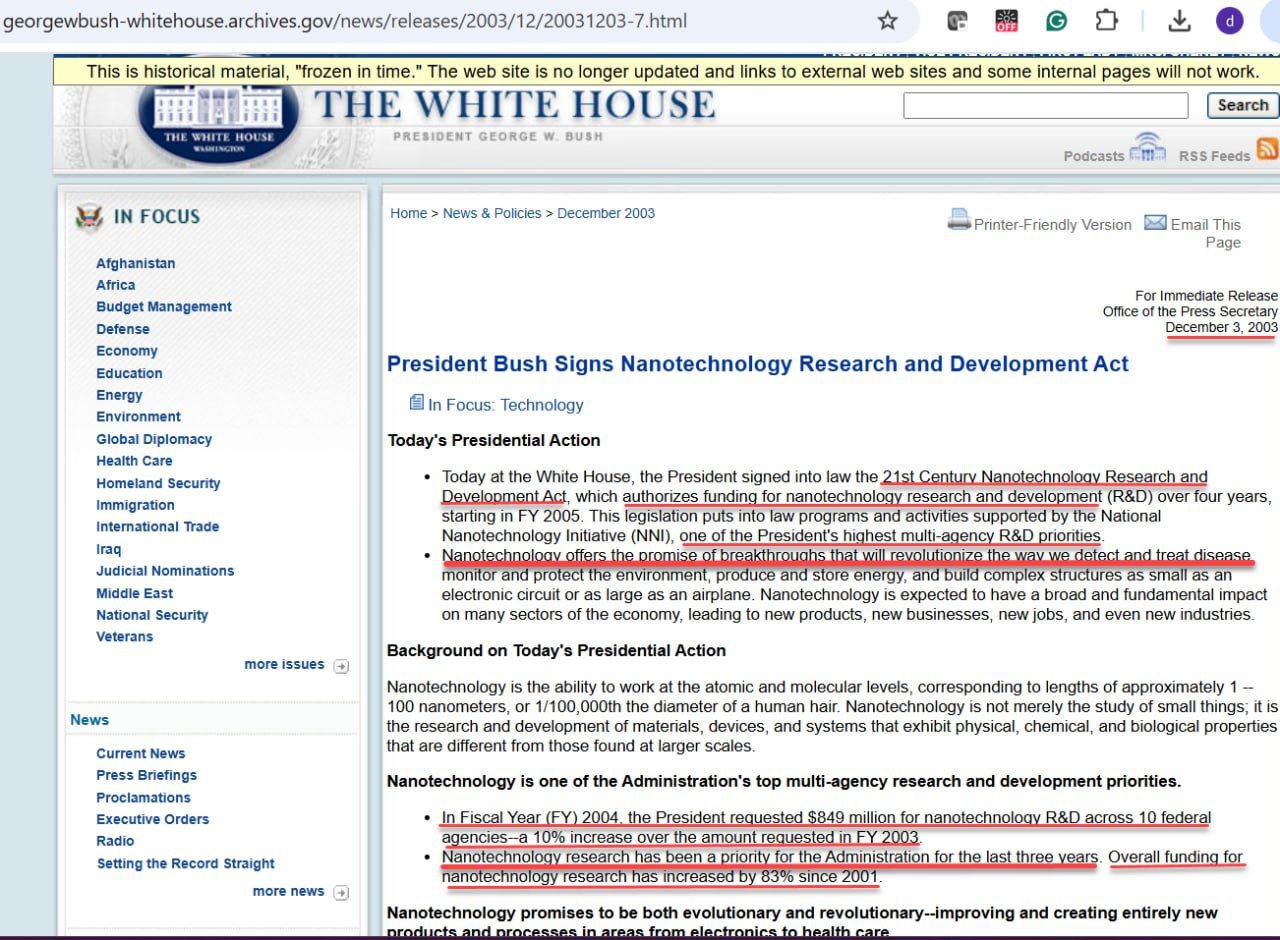 President Bush Signs Nanotechnology Research and Development Act https://georgewbush-whitehouse.archives.gov/news/releases/2003/12/20031203-7.html