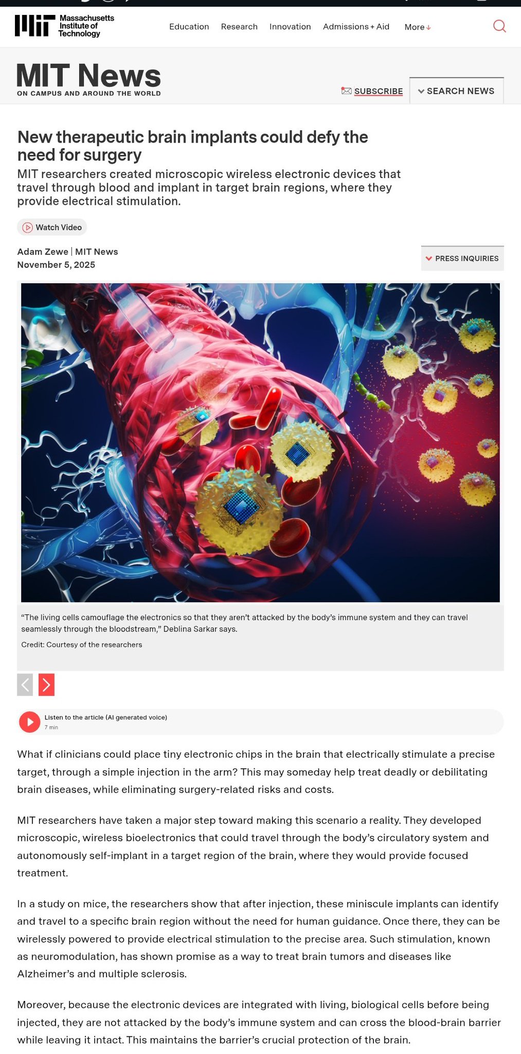 MIT researchers created microscopic wireless electronic devices that travel through blood and implant in target brain regions, where they provide electrical stimulation https://news.mit.edu/2025/new-therapeutic-brain-implants-defy-surgery-need-1105