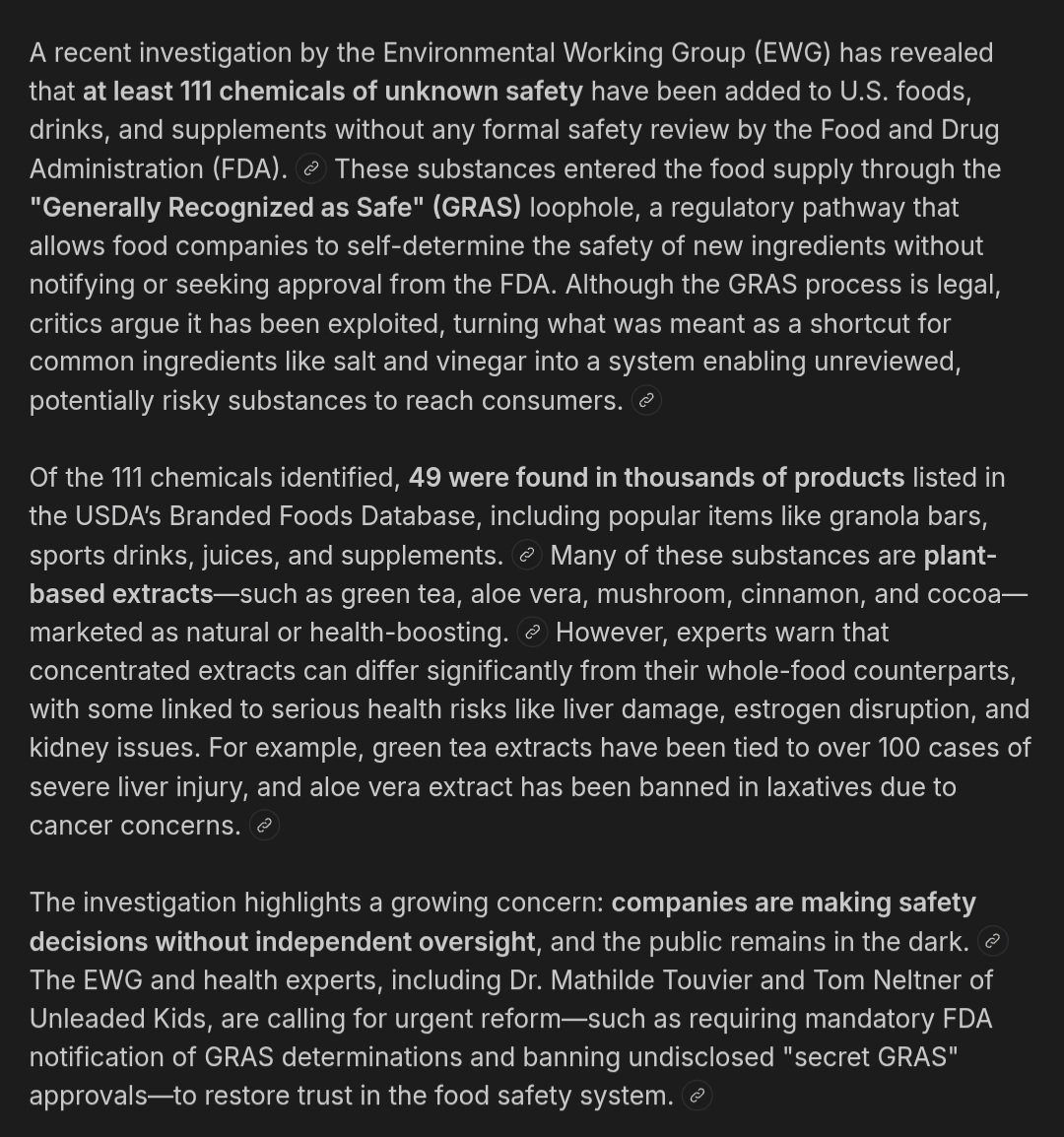 A recent investigation by the Environmental Working Group (EWG) has revealed that at least 111 chemicals of unknown safety have been added to U.S. foods, drinks, and supplements without any formal safety review by the Food and Drug Administration (FDA) https://search.brave.com/search?q=A+recent+investigation+by+the+Environmental+Working+Group+has+exposed+a+significant+regulatory+gap+in+the+American+food+supply%2C+identifying+111+substances+added+to+food+and+drinks+without+any+review+from+the+Food+and+Drug+Administration.&source=android&summary=1&conversation=08d645496af8bf9235cce051a25a631c712f