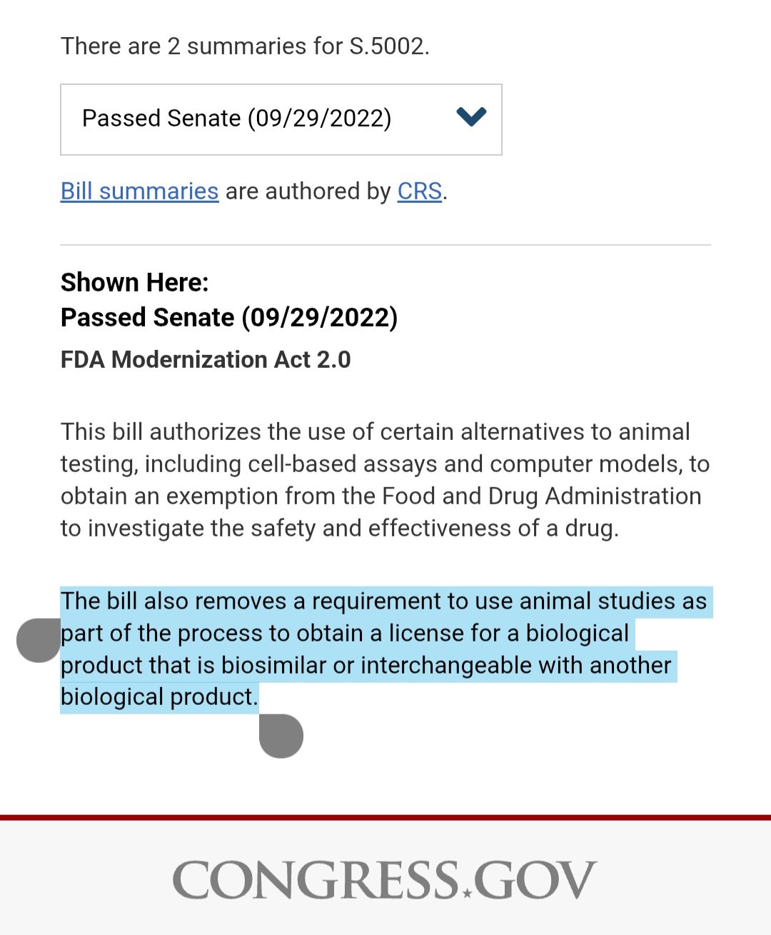 The bill also (removes a requirement to use animal studies as part of the process to obtain a license) for a biological product that is biosimilar