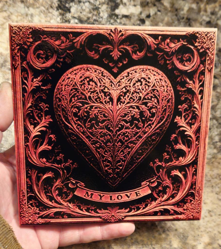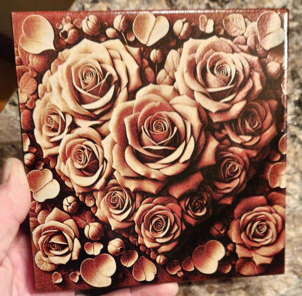 Painted ceramic tile. I painted it then laser engraved the paint away to create the image