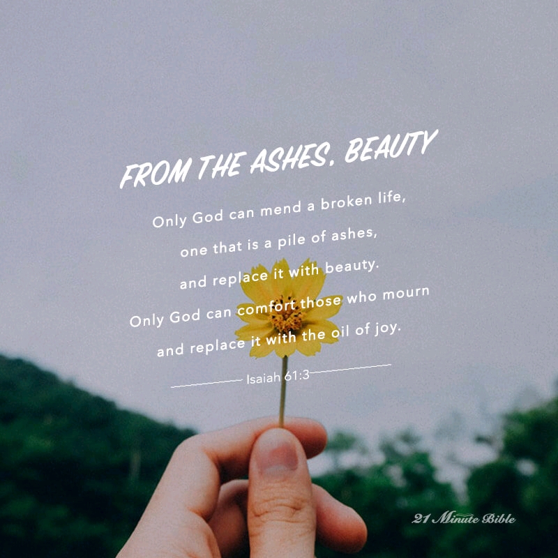 If you ask for forgiveness, if you ask for anything, God will hear you. Confess your sins and be forgiven. This is often the hardest step, however, especially if some of the sins that we have committed are too hard to look back on. Looking back and asking for forgiveness is the first step in moving forward. Only God can mend a broken life, one that is a pile of ashes, and replace it with beauty. Only God can comfort those who mourn and replace it with the oil of joy. Turn to the Lord when your life is darkest, seek forgiveness, and He will transform it, no matter how tangled and broken it may be, into something beautiful.