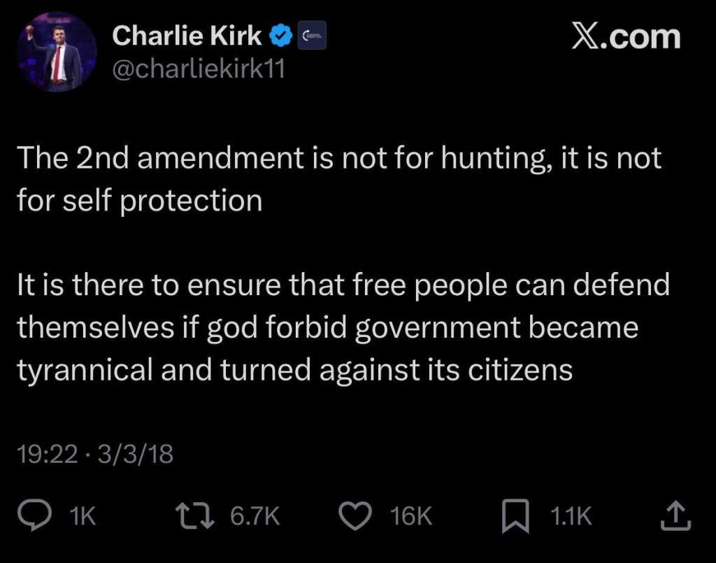 Charlie was wrong, the 2nd is for whatever lawful use you decide to use a weapon for, including resistance to tyranny!