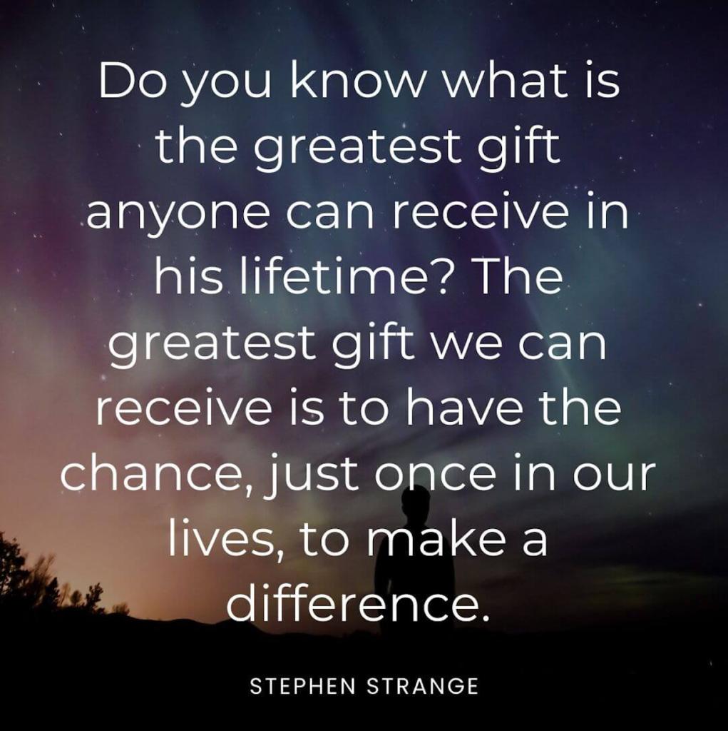 “Do you know what is the greatest gift anyone can receive in his lifetime? The greatest gift we can receive is to have the chance, just once in our lives, to make a difference.” — Stephen Strange