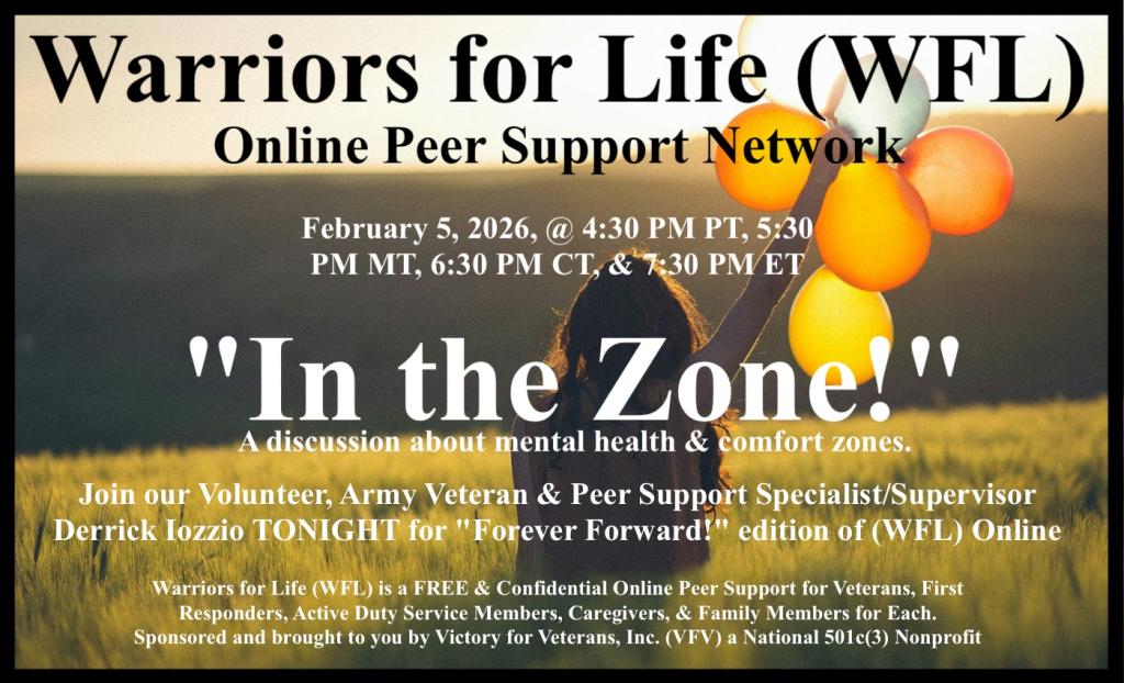Warriors for Life (WFL) Online "Forever Forward!" edition presented by Victory for Veterans, Inc. (VFV) — Thursday (TONIGHT), February 5, 2026, @ 4:30 PM PT, 5:30 PM MT, 6:30 PM CT, & 7:30 PM ET