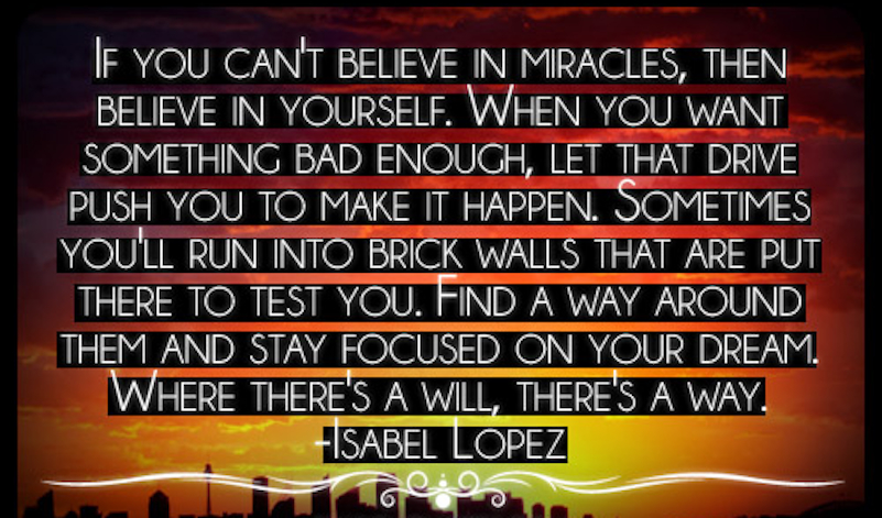 “If you can’t believe in miracles, then believe in yourself. When you want something bad enough, let that drive push you to make it happen. Sometimes you’ll run into brick walls that are put there to test you. Find a way around them and stay focused on your dream. Where there’s a will, there’s a way.” — Isabel Lopez