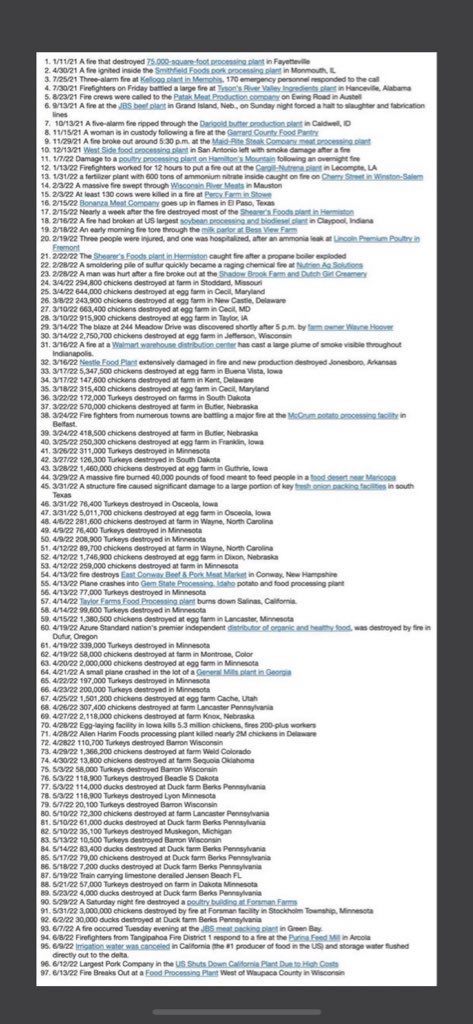 Here's a copy of ALL the manufacturer, meat, poultry pork and fertilizer plants that been going up in SMOKE ( Purposely done by freemasons and elites )