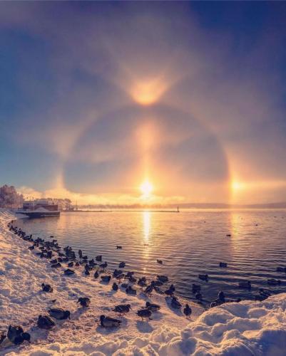 #Repost///@starworldlab: A solar halo over Östersund, Sweden. This is an optical phenomenon where a circle of light forms around the Sun or Moon. It’s created by light refracting through hexagonal ice crystals in the atmosphere[📷 @vrennerstahl]