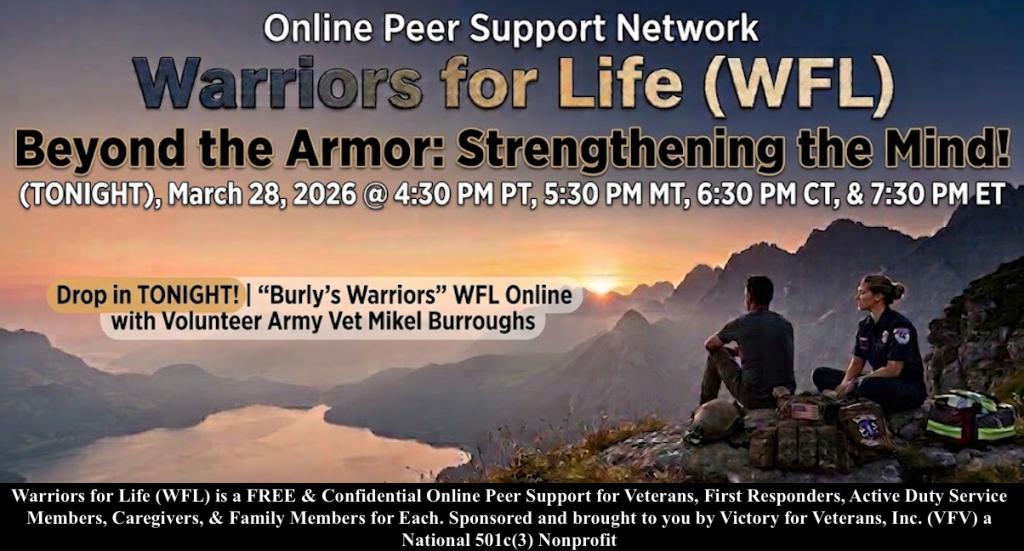 Warriors for Life (WFL) Peer Support Network Online "Burly's Warriors" edition, presented by Victory for Veterans, Inc. (VFV) — (TONIGHT), March 28, 2026 @ 4:30 PM PT, 5:30 PM MT, 6:30 PM CT, & 7:30 PM ET